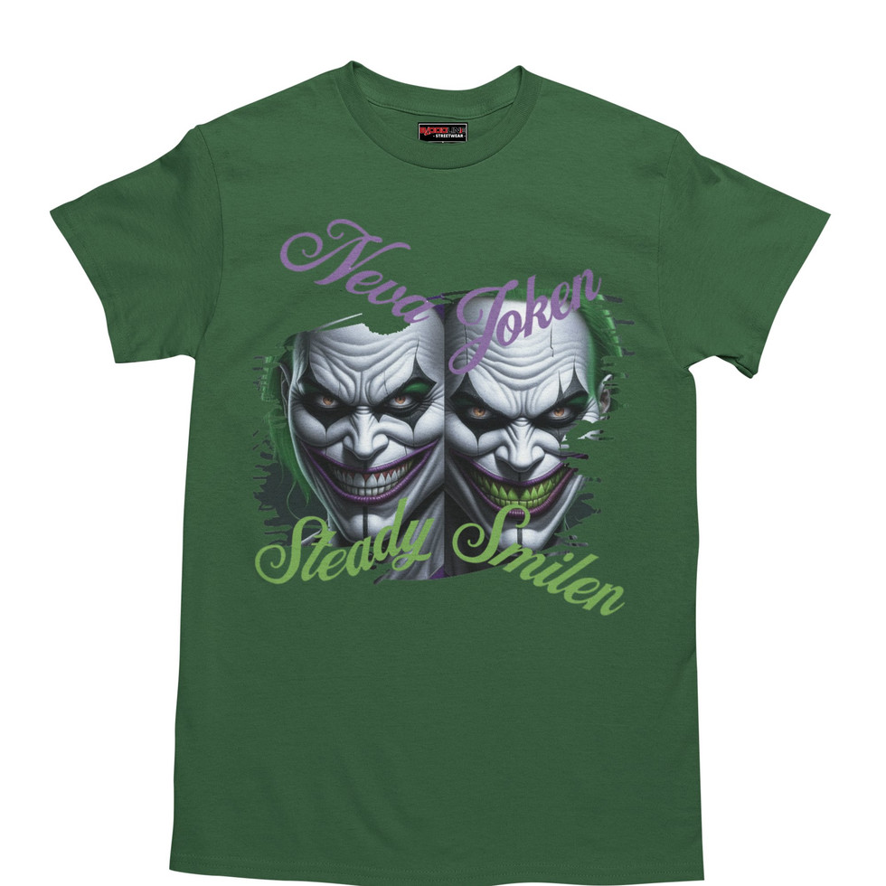 Introducing the Neva Joken tee, featuring a bold and playful joker face design on the front.